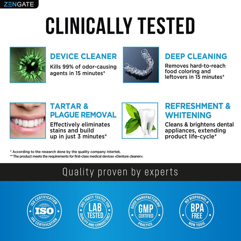 - Professional-Grade Dental Device Cleaner: Zengate Retainer Cleanser offers professional-grade cleaning for dentures, retainers, aligners, and mouthguards, effectively eliminating over 99.9% of harmful debris, restoring them to a bright, like-new condition.
