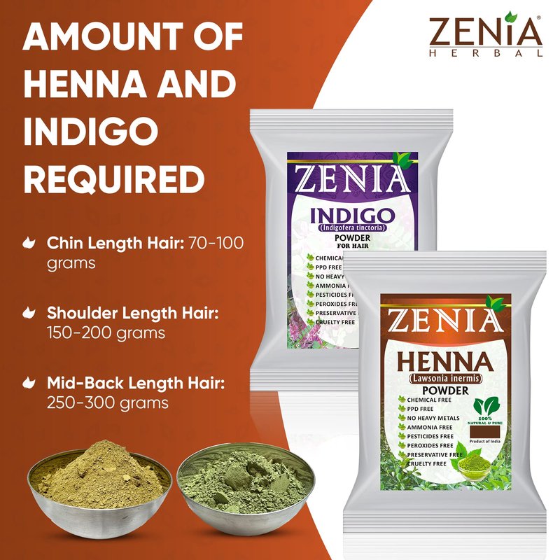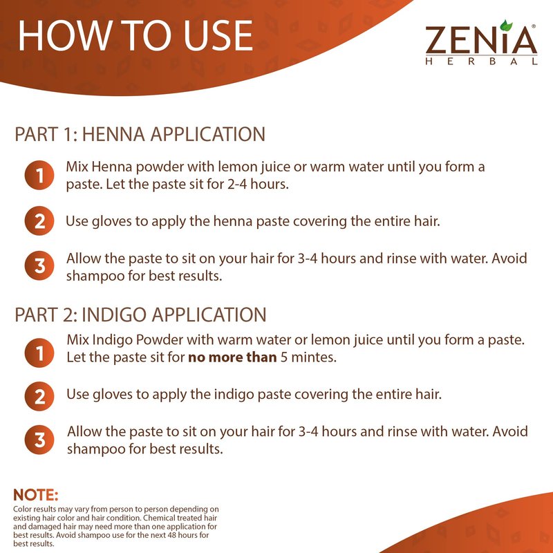 - HOW TO USE: First apply Zenia Pure Henna paste on your hair and let it sit for 3-4 hours. Rinse and wash your hair with water. Next, make a Indigo Powder paste by mixing with warm water or hot lemon juice and apply within 10 minutes of mixing. Apply the paste to sit for 2 to 3 hours then rinse with water. Do not use shampoo for the next 24 hours for best results.