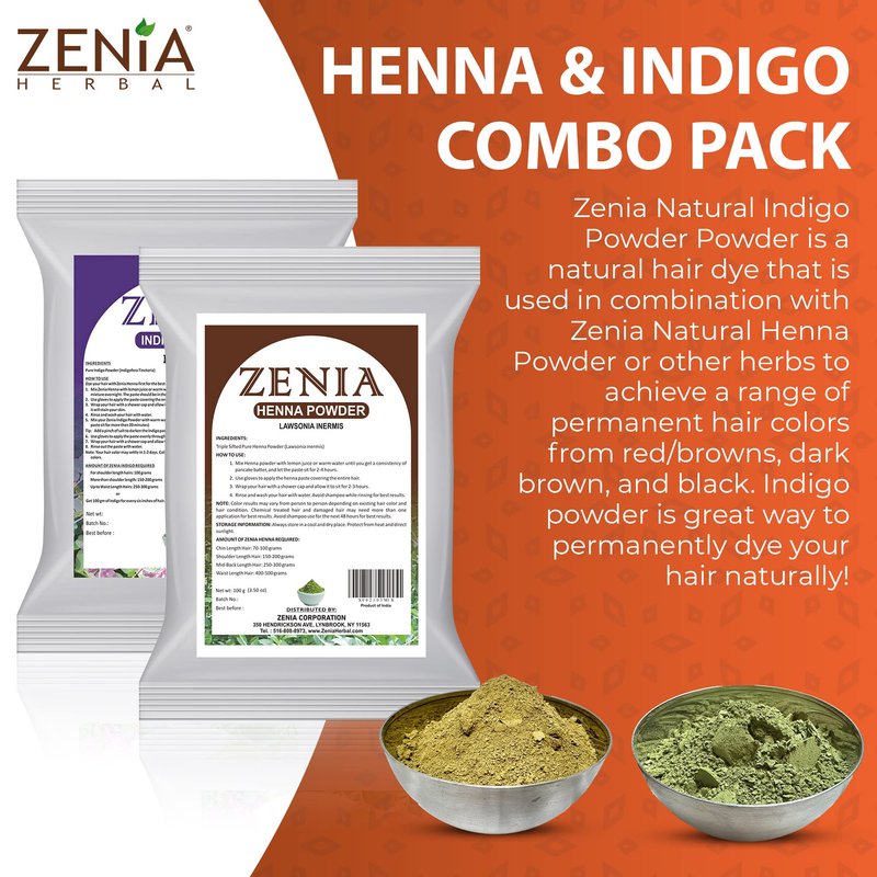 THIS KIT INCLUDES: 100 grams Henna Powder and 100 grams Indigo Powder Zenia Natural Indigo Powder Powder is a natural hair dye that is used in combination with Zenia Natural Henna Powder or other herbs to achieve a range of permanent hair colors from red/browns, dark brown, and black. Indigo powder is great way to permanently dye your hair naturally!