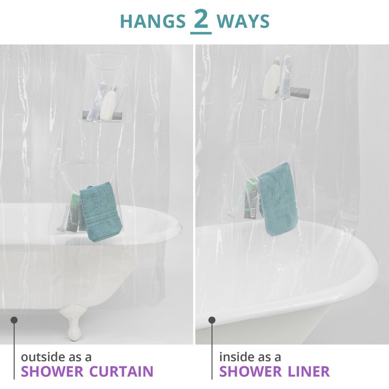 - WORKS AS A WATERPROOF SHOWER LINER AND A SHOWER ORGANIZER: Mesh pockets shower curtain features waterproof PEVA construction to keep water inside your shower; hang outside the tub to use as a shower curtain