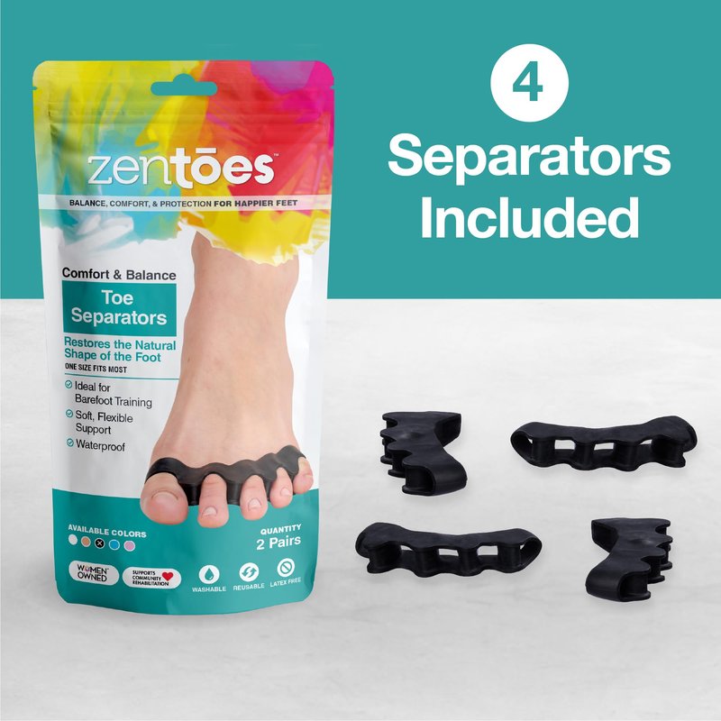 - Gel Toe Separators - The soft, stretchy material makes ZenToes all toe separators ideal for use during yoga and other barefoot training exercises. They are also comfortable to wear under socks or inside wide fitting shoes and can be hand washed in warm soapy water, air dried, and reused over and over.