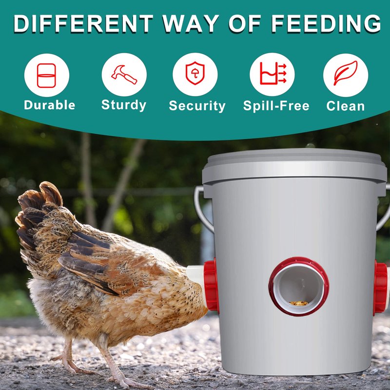 - Automatic chicken feeder: Chicken feeder has a 3" diameter hole. When chickens feed through the feed opening, gravity allows food to flow directly downward, which helps chickens to take their feed easily and freely. We provide feeder opening plugs, which can be plugged into the feed opening at night to prevent anything from entering the feed bucket and preventing feed loss