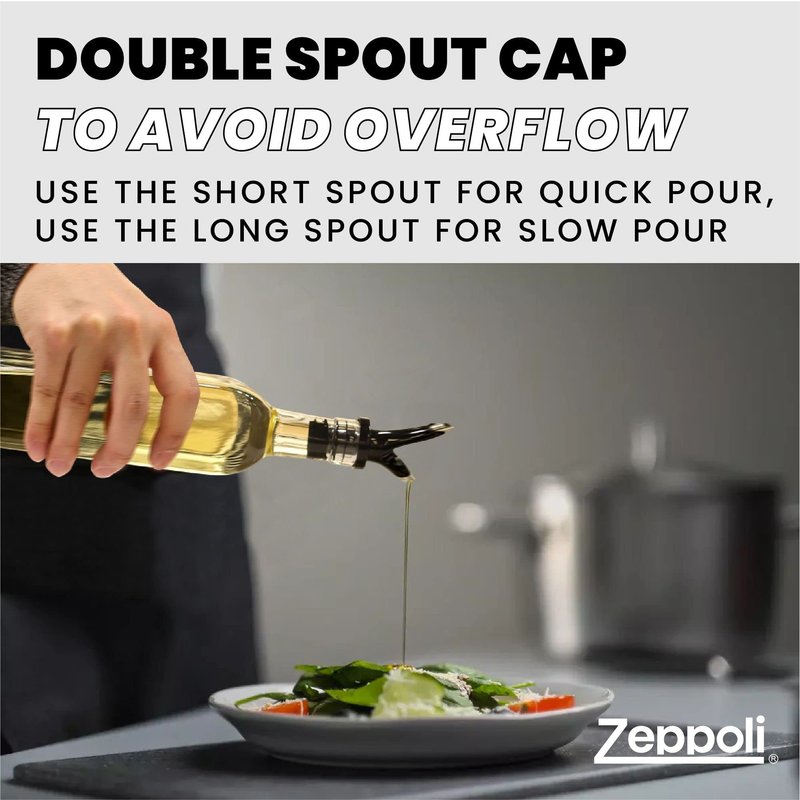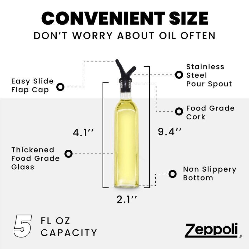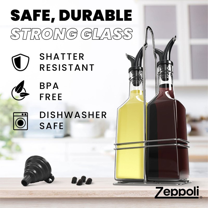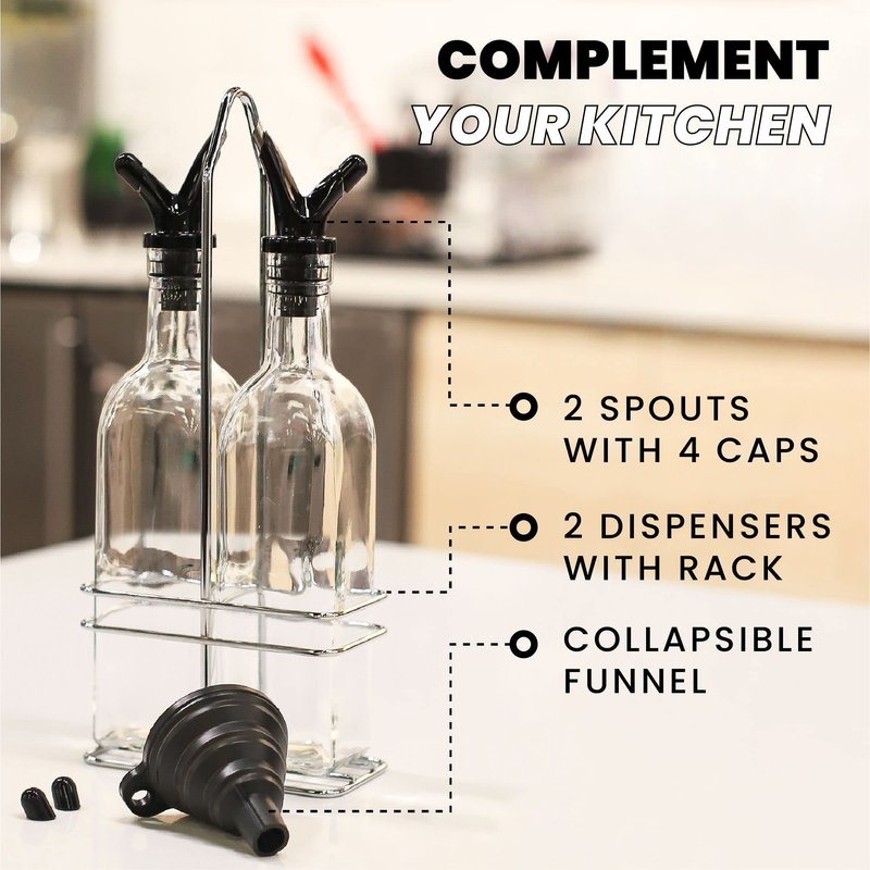 Zeppoli Kitchen Olive Oil Dispenser Bottle Set 5 oz - Stainless Steel Rack 2 Pack - Oil & Vinegar Dispenser Set - 4 Removable Dual Spout, Pouring Funnel - Glass Bottle Set - Cruet, Stainless Steel