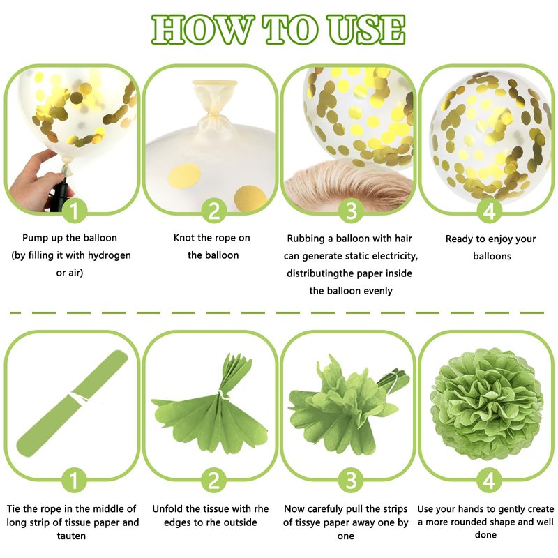 - Easy To Assemble: To create sage atmosphere,as physical seller hanging display goods or photography props. The Tissue Pom Pom are individually packed with easy to follow instruction. It is shipped flat and what you need to do is to fluff it out and hang. The sage green balloons set are also perfect for assemble to balloon arch or garlands.