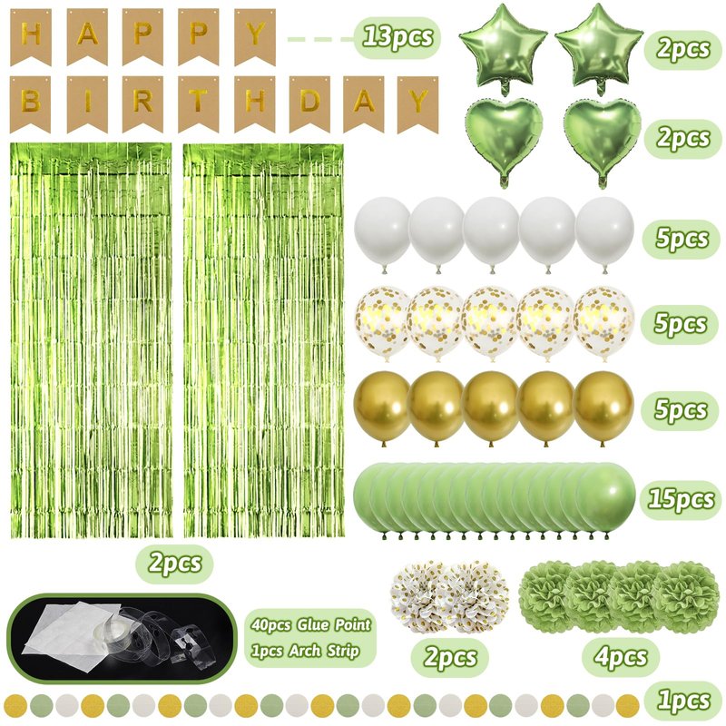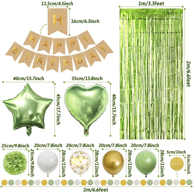- What You Will Get: 1 x HAPPY BIRTHDAY banner, 4 x sage green paper pompoms, 2 x gold polka dot paper pompoms, 2 x star foil balloons, 2 x heart foil balloons, 2 x sage green fringe shiny curtains, 1 x paper garland, 15 x sage green balloons, 5 x gold balloons, 5 x white balloons, 5 x gold confetti balloons, 1 x balloon arch strip, 40 x glue point stickers.