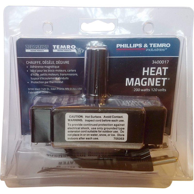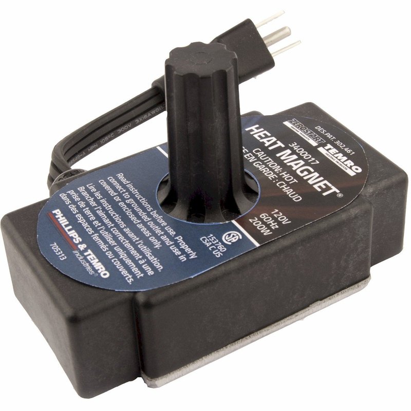 - Magnetic engine block heater provides heat where and when you need it