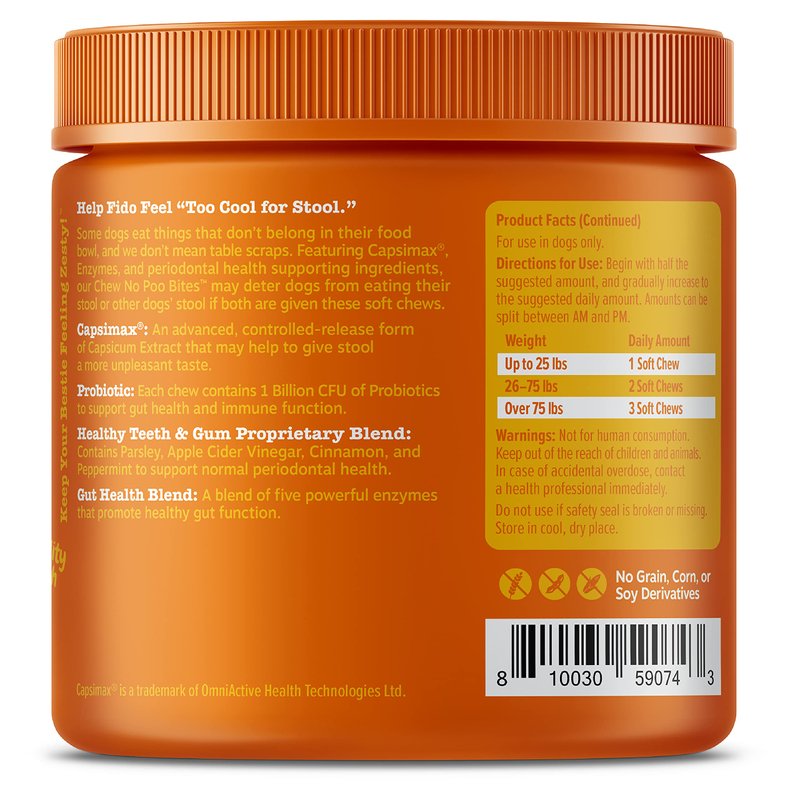 - Help Fido Feel "Too Cool For Stool" - Zesty Paws Chew No Poo Bites are chewables that may function as a poop eating deterrent and digestive helper for furry friend's not-so cute habit.