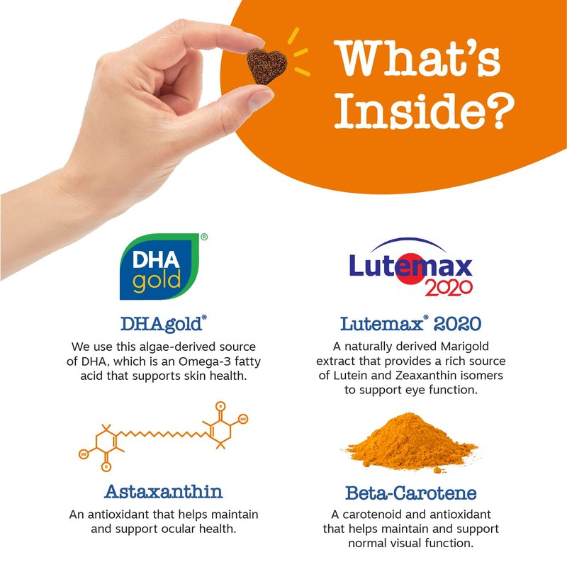 - Eye Health - Each bite contains AstaZine, a certified organic Astaxanthin that supports ocular health, while Beta Carotene supports normal visual function.