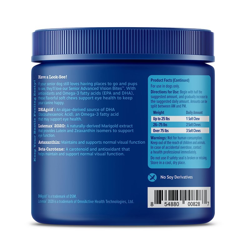 - Omega-3 Fatty Acid - Senior Vision Bites also feature Cod Liver Oil and DHAgold, an algae derived source of Omega 3 DHA to support overall skin health for older dogs.