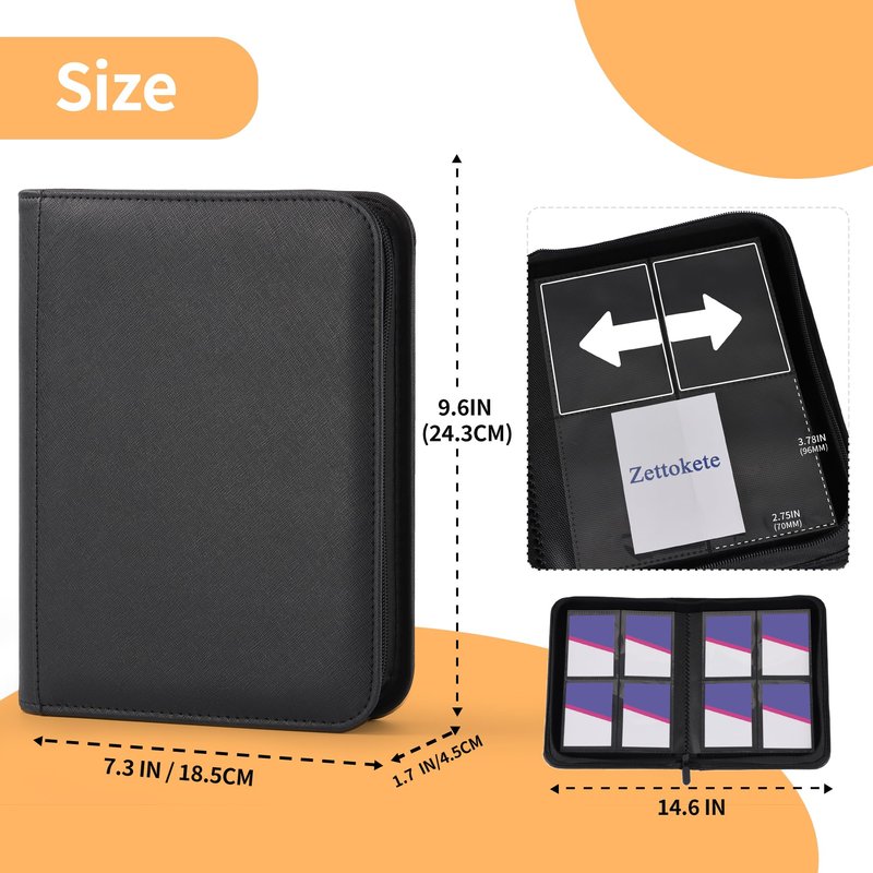 Zettokete 160 pockets trading card binder can meet your cards collection needs.It can help you storage and organize your cards and protect them.If you are a trading card or a sport card collector,you must have it!--Compatible with Standard Size Cards--Compatible with most TCG cards and sports cards.Each pocket is 70 MM / 2.75"(W), 96 MM / 3.78"(L).--Sturdy Cover--The collector card binder has padding on both the front and back covers,making the binder more sturdy.Better to keep your cards safe in mint condition.--Waterproof--The card holder is made of premium leather.Waterproof and scratch resistant.--Zipper Design--A zipper to prevent the card and inner pages from falling off.Smooth zipper for easy opening and closing.--Side Loading Pocket--Side loading pockets are easier for inserting and retrieving cards.Also no risk of cards falling out while on the move.--20 Double-sided Card Sheets--The card sheets is made from polypropylene.No PVC and acid-free.Cards will not stick to it.High clarity sleeves let you display and see all the details of the cards.--A Good Gift--A good gift for your kids to collect cards.Specification:--Material:Leather--Item Size:9.6 IN×7.3 IN×1.7 IN--Item Weight:0.87 LB--Pocket Style:4 pocket side loading--Each Pocket Size:3.78 IN×2.75 IN--Binder Card Sleeves:20 pages(no ring)--Capacity:Totally 160 cards--Product Color:Black