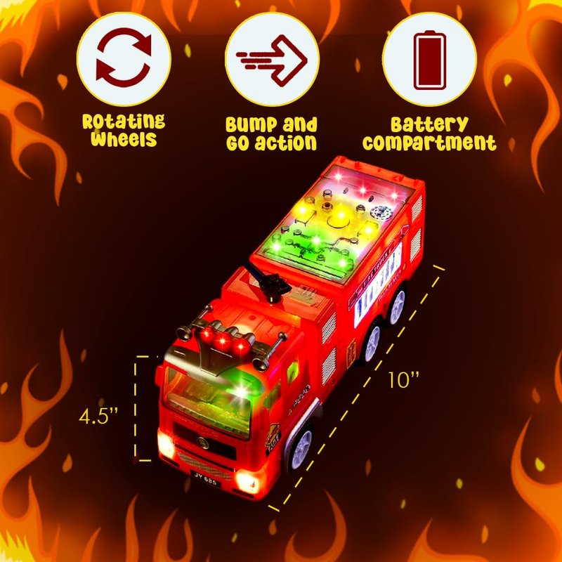 - Bump and Go Feature - This firetruck toy features a “bump and go” mechanism, teaching your kids about cause and effect. With every bump, the kids fire truck changes direction ensuring uninterrupted playtime.