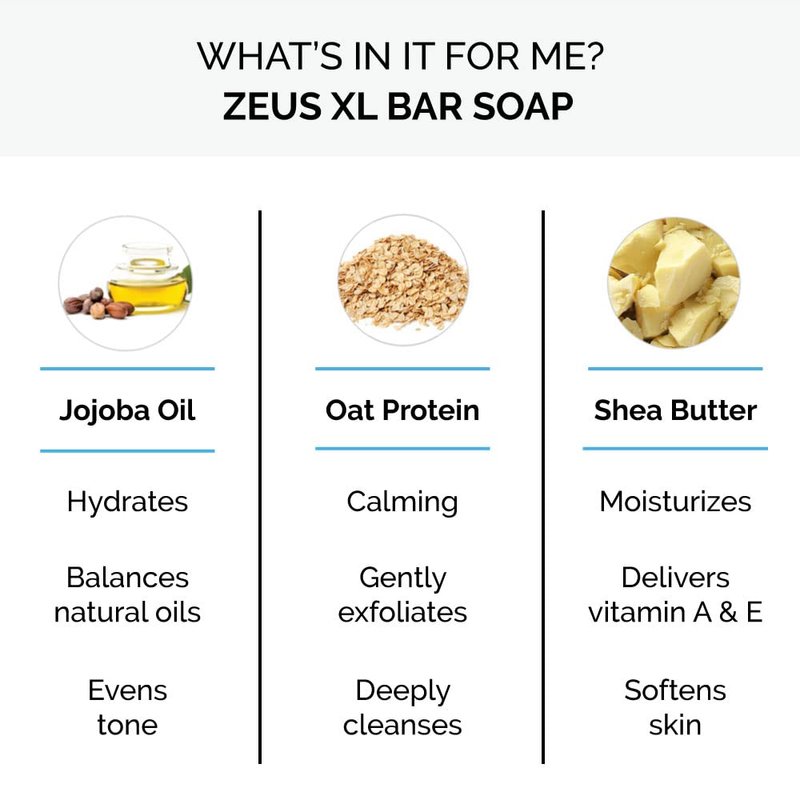- BAR SOAP: Crafted using traditional “hot pour” methods that place natural ingredients at the forefront, our large ZEUS 10 oz. Bar Soap features natural ingredients to target and aide with everyday care. Safe for sensitive and gentle on the face & body.