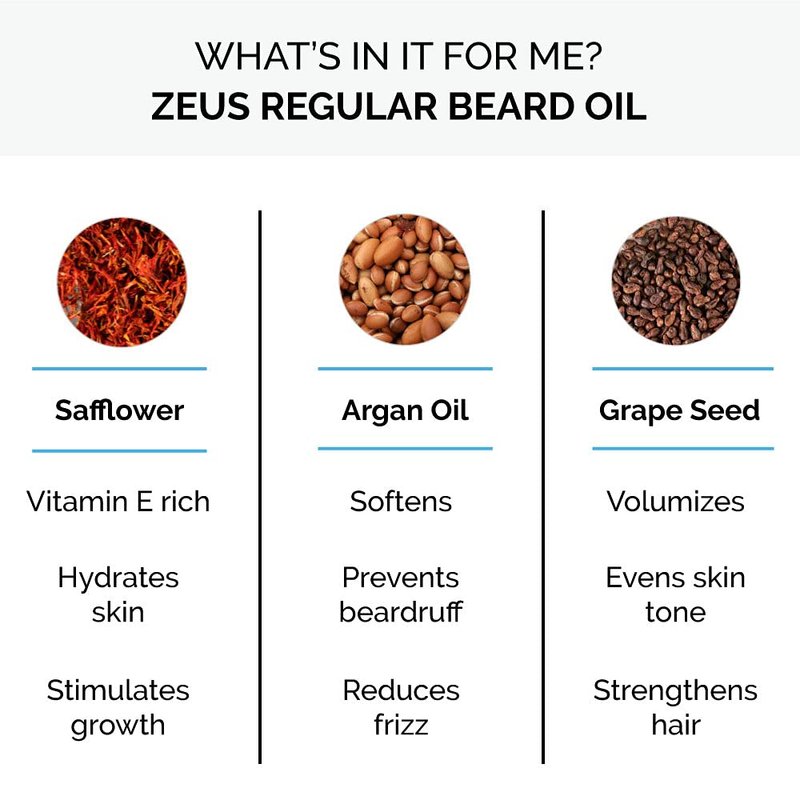 - BENEFITS: Our Beard Oil will aide your beard care without any of those harsh chemicals due to our all-natural ingredients use to target daily beard issues. Ingredients like Safflower Seed Oil to help seal moisture in your skin to aide with itching and dryness. To soften the hairs on your face, we use Argan Oil. The vitamin E in the beard oil stimulates blood circulation for elastic skin and less flaking. Grape Seed Oil is used to sooth the skin and acts as a mild astringent for acne-prone skin.