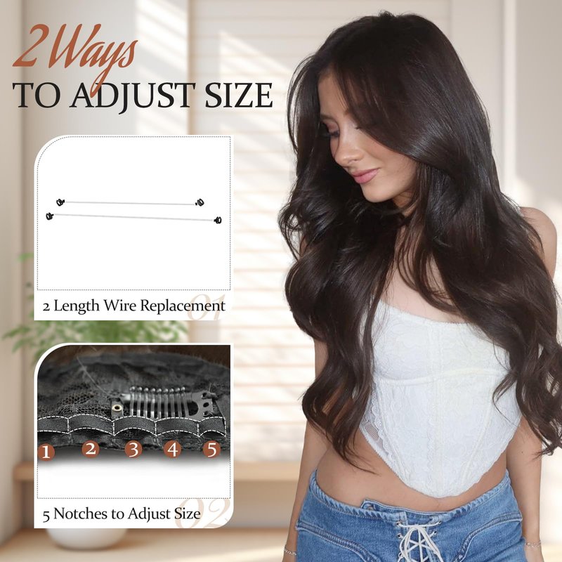 ZGYAIR Invisible Wire Hair Extensions with Transparent Wire Adjustable Size 5 Secure Clips V-Shaped Long Wavy Secret Dark Brown Hair Extension 20 Inch for Women