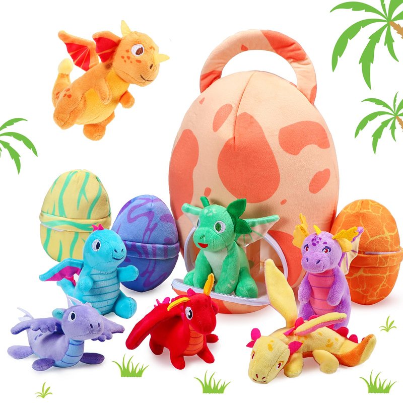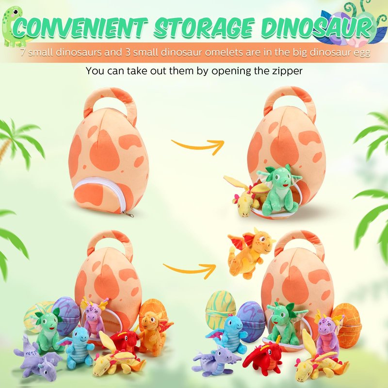- Nice Combination: there are a total of 7 small dinosaur plush toys and 1 large and 3 small dinosaur egg packs in the package, which are well matched and the quantity is sufficient to bring you a fun and enjoyable party