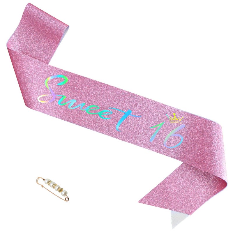 ZHBDPaty 'Sweet 16' Birthday Sash Pink Glitter with Pearl Pin Funny Party Favors Decorations For Girl Women Gift Ideas