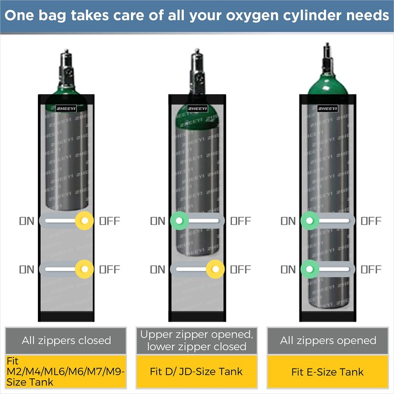 - NEED A BAG THAT FITS MULTIPLE OXYGEN BOTTLE SIZES? Unlike all those cheap oxygen cylinder bags, we have four mysterious "zippers" built in. This approach can be adapted not only to long oxygen cylinders, but also to short oxygen cylinders. Therefore, you only need to buy a bag, can adapt to a variety of sizes oxygen cylinder.
