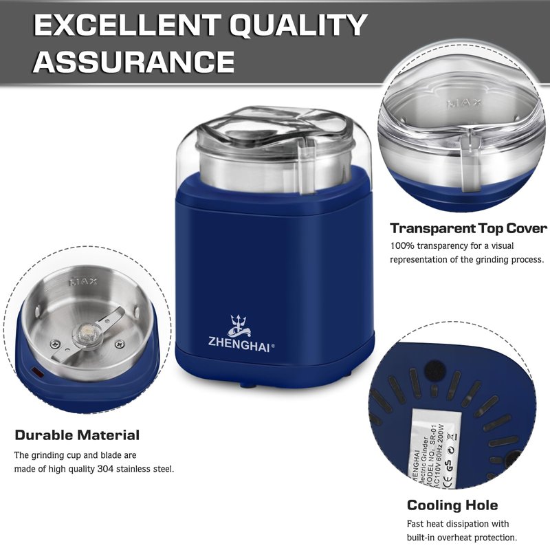 ZHENGHAI Electric Herb Grinder 200w Spice Grinder Compact Size, Easy On/Off, Fast Grinding for Flower Buds Dry Spices Herbs, with Pollen Catcher and Cleaning Brush 1.7oz Capacity (Blue)
