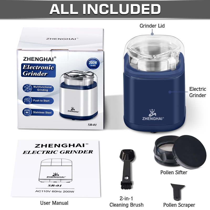 - 🌿PURCHASE INCLUDES - 1 ZHENGHAI 200W grinder, 1 Cleaning brush with spoon, 1 Pollen Sifter, 1 Pollen Scraper, 1 User Manual. Questions? Please contact us, it is our mission to provide our customers with high quality products as well as efficient and excellent service.