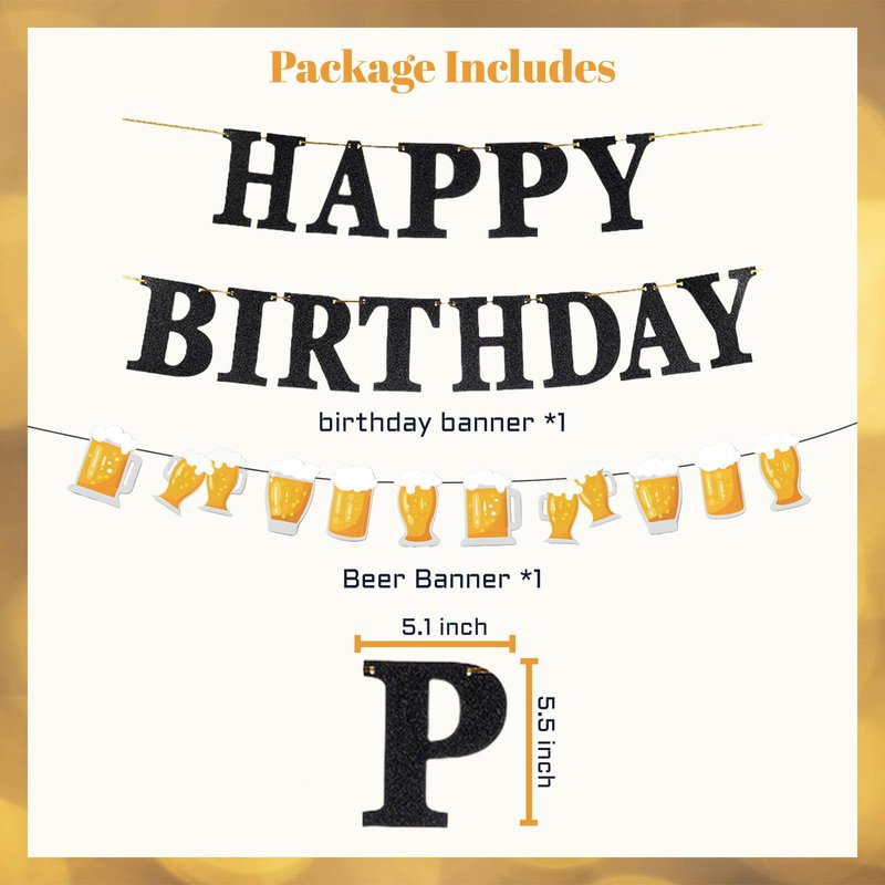 Birthday Party Decorations Set Include:1x happy birthday banner,1x beer banner,30x latex balloons(10 black, 10 gold, 10 confetti balloons),6x beer balloon,these balloon perfect for decorate birthday party.