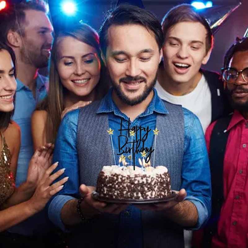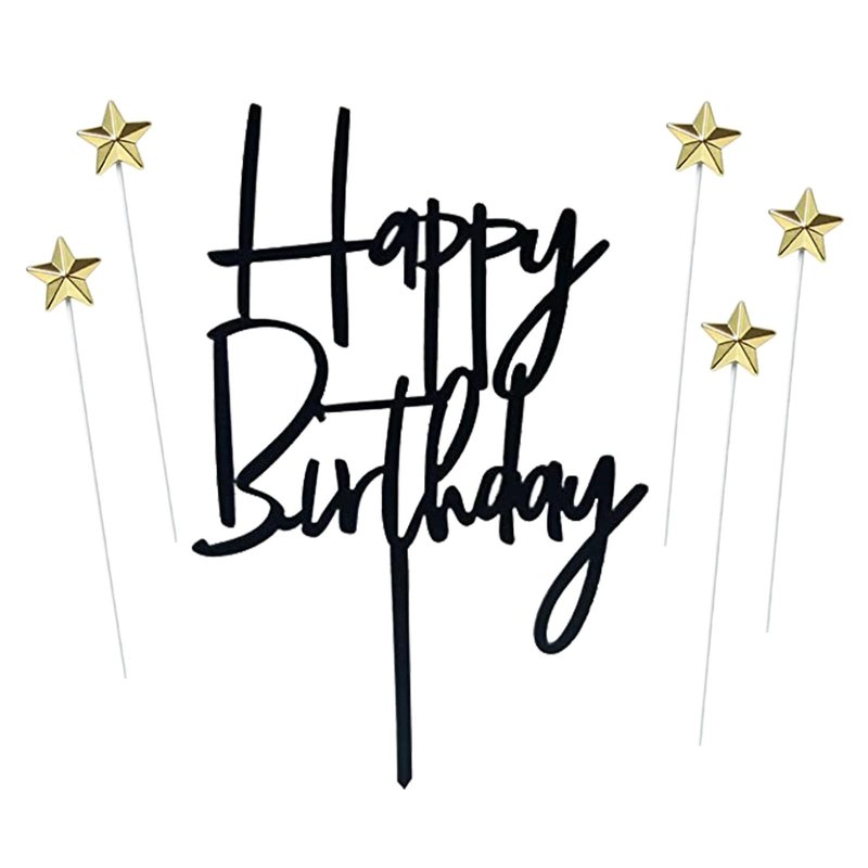 ZHENGYE Set of 1 Black Acrylic Happy birthday Cake Topper And 5 pcs glod Star Cupcake Topper Cake Decoration Supplies for Baby Shower Birthday Decorations(Black 15)