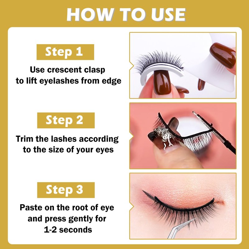 - 【How to Use】1. You can use the crescent card to gently remove it from the root of the eyelashes (note:our hands should not touch the tape, which will affect the stickiness of the tape); 2. You can trim the excess on both sides according to your eye shape; 3. Place the adhesive strip directly at the root of the upper eyelid, middle of eye first, then the head of the eye, and finally the end of the eye.e.