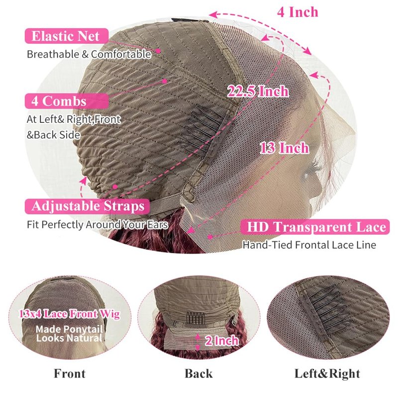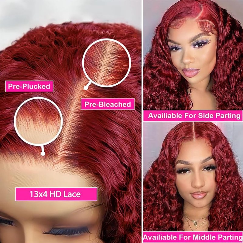 4.Burgundy Deep Wave Wig 13x4 Lace and Cap Details: 13X4 Transparent Lace Front Wig Burgundy Colored Human Hair, Swiss Lace Suitable for Skin of Various Colors, Invisible & Breathable & Beautiful. The 13x4 Lace Area Supports Middle Part and Side Part. You Can Wear Burgundy Deep Wave Lace Front Wigs Human Hair in All Occasions.