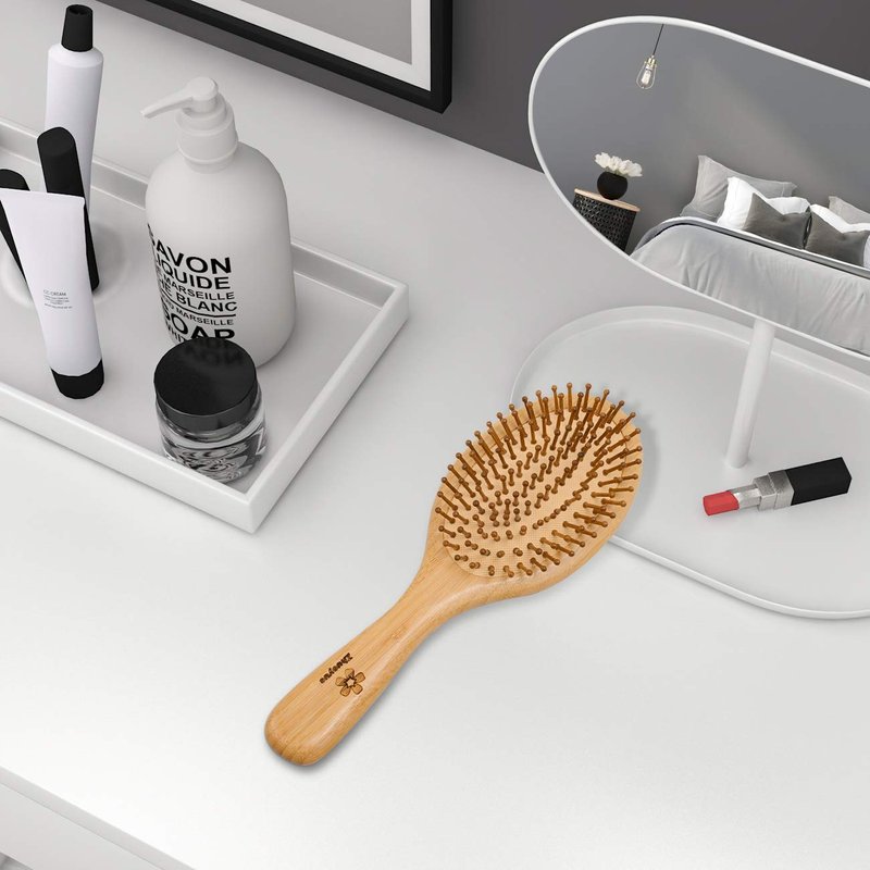 Natural Rounded Bristles: The natural bamboo bristles aid in gentle but effective scalp massaging without scraping the skin off your scalp. They evenly distribute your hair's natural oils down the hair shaft.