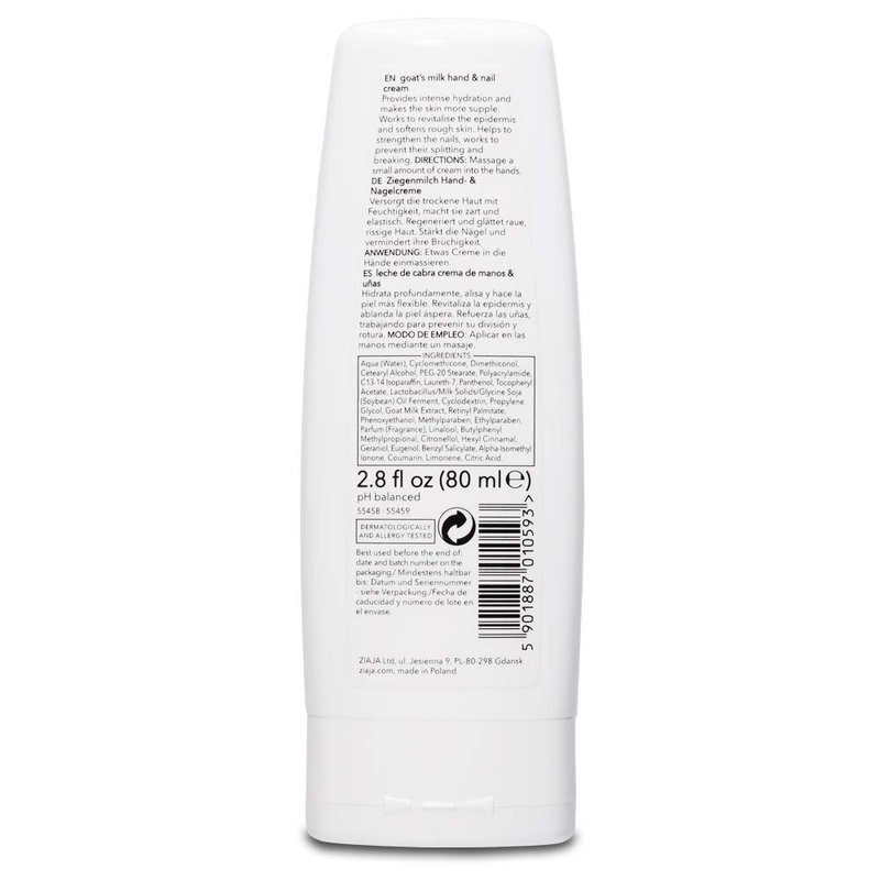 Goat's Milk Hand and Nail Cream Product Size: 2.8 fl oz (80 ml) Intensely nourishes, smoothes and firms the skin. Works to revitalize the epidermis and softens rough skin. Helps to strengthen the nails, works to prevent splitting and breaking. Key Ingredients: Goat's Milk Complex, Provitamin B5 (d-panthenol), Vitamin A, Vitamin E