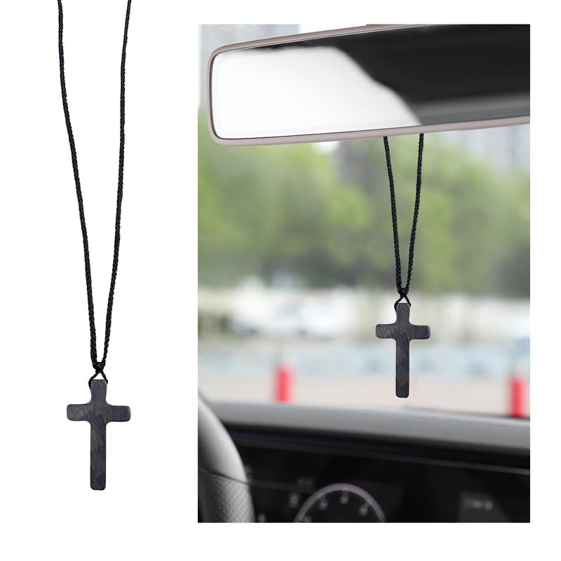 Ziciner Natural Wooden Cross Pendant Necklaces, Adjustable Handcrafted Wooden Car Rearview Mirror Pendant, Universal Vehicle Rear View Mirror Decoration for Men and Women (Standard, Black)