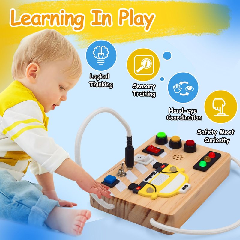 - Durable & Portable - This LED busy board requires 2 AAA batteries (not included), they are hidden on the back for security. It lasts long if remember to turn all lights off. A perfect toy to keep your child occupied while at home or travel in car, plane or train etc.