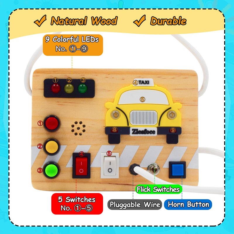 This ZIESFOCE Montessori Toys Wooden Busy Board with LED Light Switch is specially designed for 3+ year old toddler to learn and improve motor, congnitive and problem solving skills. Perfect toy for travel