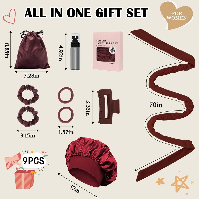 - BEST GIFT: Non heat curling set includes 9 pieces: 1 velvet curling headband (70 inches long), 1 hair clip, 2 velour hair ties, 2 elastic hair ties, 1 satin hair bonnet, 1 velour storage bag, and 1 spray bottle. All sets are packaged in a beautiful gift box, you can achieve beautiful curly hair anytime. This is also a perfect gift for family, friends and colleagues. This way, they can also have natural and amazing curly hair.