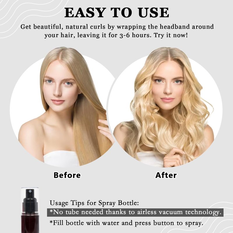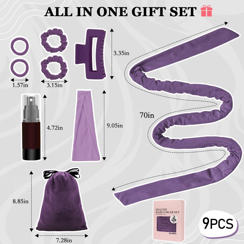 - Perfect Gift: This 9-piece hair curler set includes: 1* 70-inch long curling headband, 2* velour hair ties, 2* elastic hair ties, 1* velour storage bag, 1* hair clip, 1* yoga band, 1* spray bottle. All-In-One set is the perfect gift for family, friends, and colleagues in Christmas, New Year's Day, Birthday, Teacher's Day,Mother's Day,Valentine' Day.