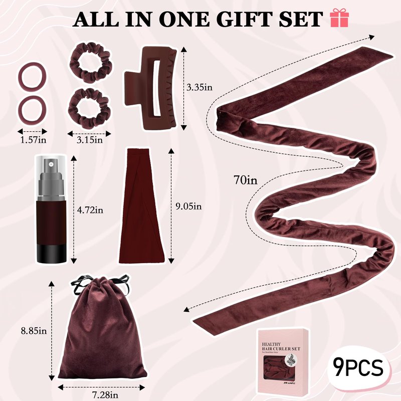 - Perfect Gift: This 9-piece hair curler set includes: 1* 70-inch long curling headband, 2* velour hair ties, 2* elastic hair ties, 1* velour storage bag, 1* hair clip, 1* yoga band, 1* spray bottle. All-In-One set is the perfect gift for family, friends, and colleagues in Christmas, New Year's Day, Birthday, Teacher's Day,Mother's Day,Valentine' Day.