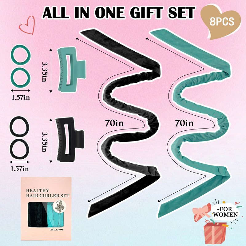 - BEST GIFT: Non heat curling set includes 8 pieces: 2 velvet curling headband (70 inches long), 2 hair clip, 4 elastic hair ties. All sets are packaged in a beautiful gift box, you can achieve beautiful curly hair anytime. This is also a perfect gift for family, friends and colleagues. This way, they can also have natural and amazing curly hair.