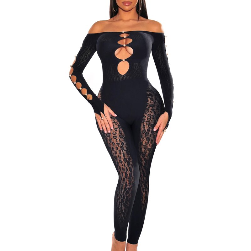 - Features:This sexy off shoulder,see through,sheer mesh, front cut-out jumpsuit can show your body curvy and make you more attractive;High stretchy can suitable for different body shapes;The pearl button design creates a charming and elegant style.