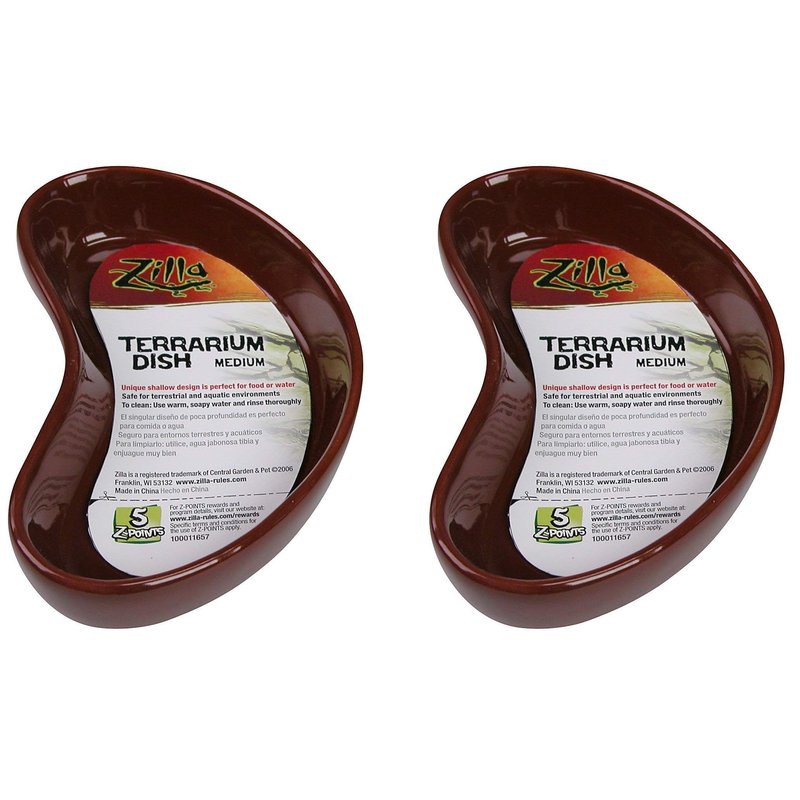 Zilla food and water dishes provide an essential area to keep food and water protected in the habitat. The low sidewalls make bowls easily accessible and places daily nourishment within reach of any size reptile. The durable and heavy construction limits spills and pushing around the habitat. Easy to clean with soap and water to help keep the terrarium healthy. 2 Pack, Medium.