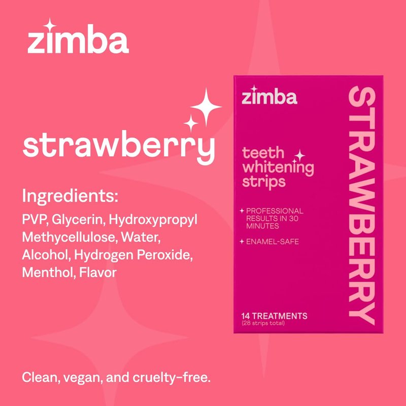 - Color: Zimba Strawberry Flavored Teeth Whitening Strips | Vegan, Enamel Safe Hydrogen Peroxide Teeth Whitener for Coffee, Wine, Tobacco, and Other Stains | 14 Day Treatment | Strawberry