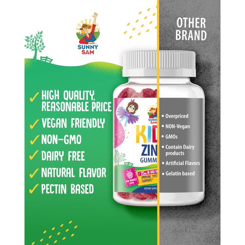 SUNNY SAM'S extra strength Zinc Gummies with mixed berry flavor and Vitamin C support skin and immunity, enhance hair, skin, and nail, and promote better rest for kids, women, and men. They are gluten-free, made with premium ingredients, suitable for children, and offer a convenient and effective way to boost your daily zinc intake.* SPECIFICATION: Count: 90 (1 per serving) Flavor: mix berries Form: Chewable Gummy MAIN INGREDIENTS + nutritional value (mg) FEATURES: Pectin based, vegan & vegetarian friendly. Non-GMO, gluten & dairy free, keto-friendly, sugar-free. Contains no artificially derived colors or flavors. Zzzzinc Your Way to Slumber: Chewable snooze buttons for dreamy night!