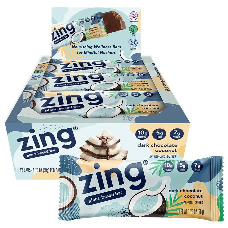 Zing Dark Chocolate Coconut Vegan Protein Bars, Gluten Free with High Protein, High Fiber, Dairy Free Nutrition Bars, Plant Based Protein, Kosher, Low Sugar, No Sugar Alcohols - 12 count