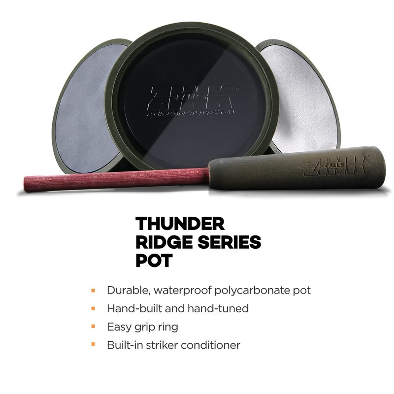 - ZINK POT CALLS - The perfect pot call starts with the perfect materials; The Thunder Ridge Series Pot Call is crafted using state-of-the-art injection molding technology - it is made of durable polycarbonate that provides dependable use