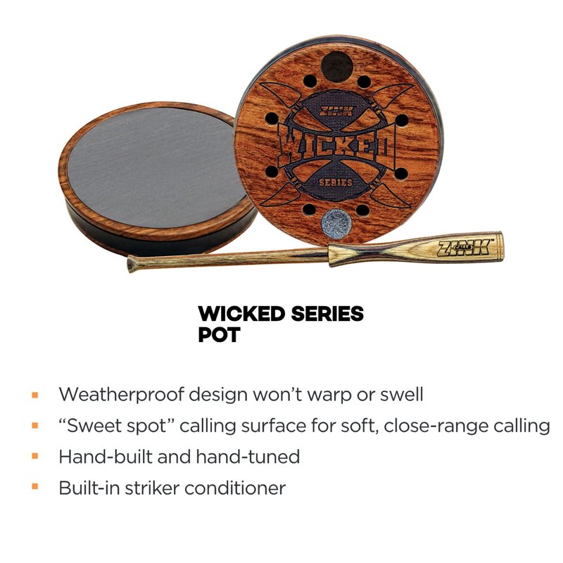 - REALISTIC SOUNDS - The Zink Wicked Series pot and striker deliver impeccable sounds with traditional design and modern technology - with this hunting game call you can produce various turkey-attracting sounds: yelp, cluck, and cutt