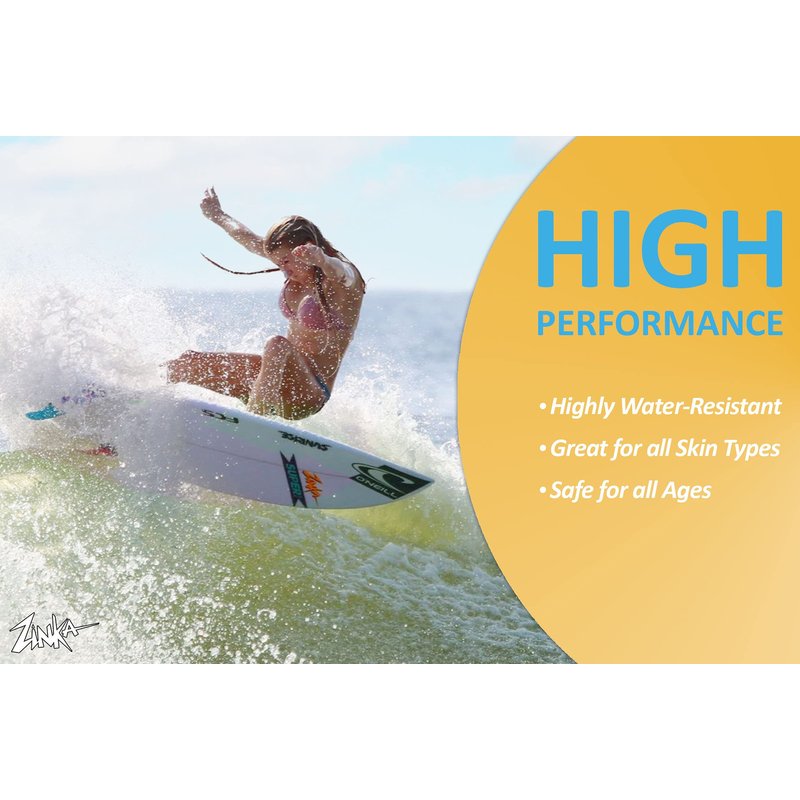 - HIGH PERFORMANCE: Whether you’re building sandcastles, playing beach volleyball, running, biking, surfing, or splashing in the pool, Zinka’s got you covered! Our high-performance mineral formula provides the ultimate sunblock and water-resistant protection for all skin types. Safe for all ages. Reapply often with all outdoor activities.