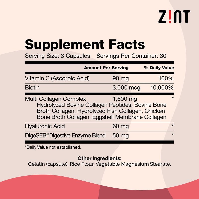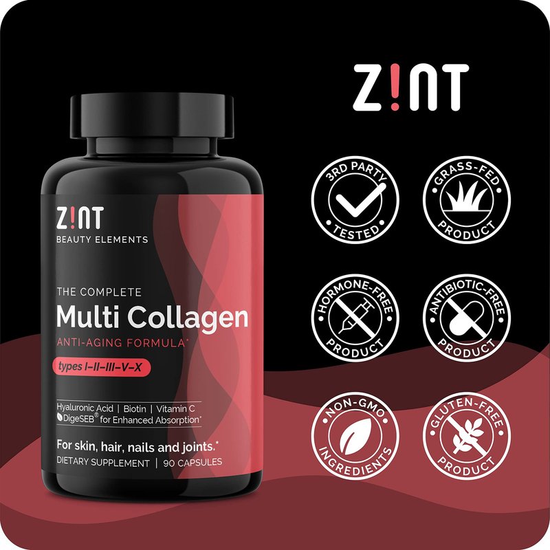 - The Complete Anti-Aging Complex — Experience Zint’s comprehensive super beauty formula, with 5 types of collagen peptides powder, biotin, hyaluronic acid, vitamin C, and DigeSEB for the full spectrum of anti-aging nutrition.