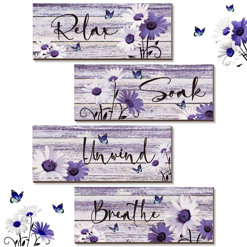 ZINYAZHE 4 Pcs Farmhouse Bathroom Wall Decor Purple Daisy Floral Flowers and Butterfly Purple Bathroom Wall Art Relax Soak Unwind Breathe Rustic Wood Plaque for Home Spa Laundry (Purple,10 x 4 Inch)