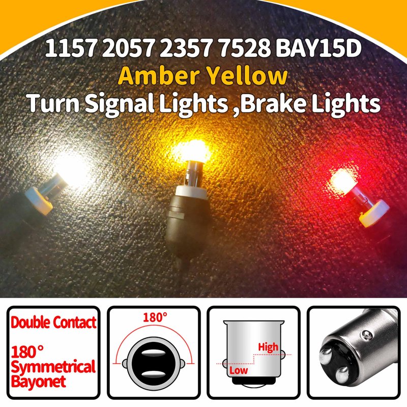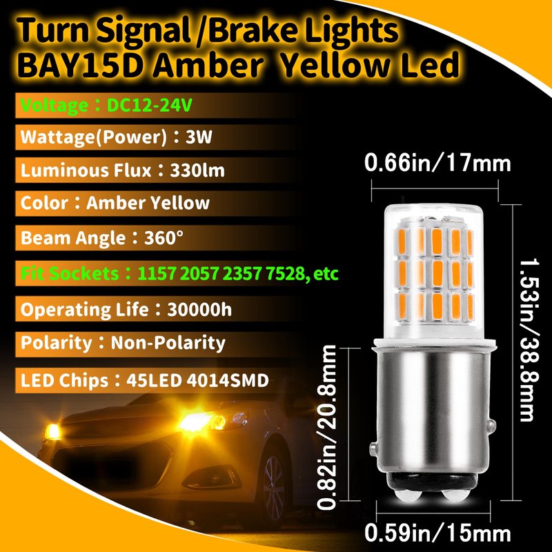 - Specifications: 12 Volt Brake Lights 1157 2057 2357 7528 BAY15D Amber LED Bulbs Replacement for RV Car Camper Trailer Tail Brake Stop Lights, Amber Yellow,DC12-24V,4Pack,Size:0.66*1.53inch,3W,330lm.