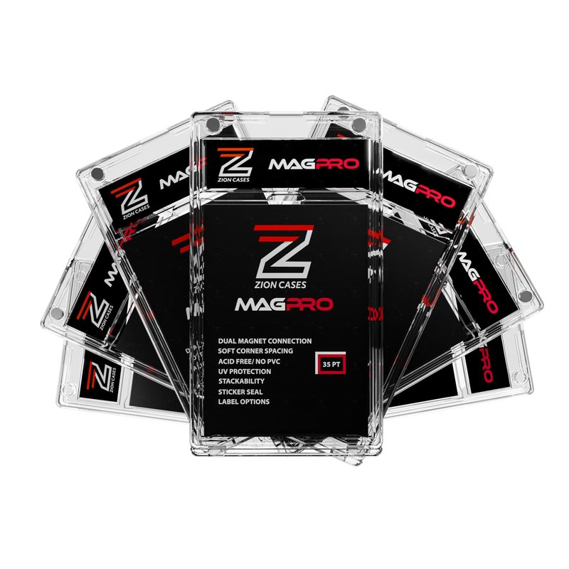 We have redefined the Magnetic Card Holder! Introducing the Magpro by Zion Cases. This version of the trading card holder has new features and upgraded options that will give the collector more protection and appeal in the trading card hobby or at trade night events. Zion Cades is continuously developing new products that provide each card collector with precisely what they need to protect their trading cards. MagPro has quickly become the go-to choice for collectors looking to protect their valuable cards and have that graded card look simultaneously. Whether someone is a seasoned collector or just starting, MagPro is the perfect solution for anyone looking to protect their collection. Magnetic card holders for trading cards on the market today have a single magnet closure that we felt was not sufficient to prevent unintended or accidental openings. That's why we created MagPro with 2 powerful magnets for optimal security of your valuables and a lot more. The MagPro magnetic card case is compatible with all Zion Slab Cases, and the clear plastic offers secure protection of your valuable trading cards without losing that crisp graded card look. MagPro was designed similar in size to the standard PSA graded card slabs to ensure uniformity across your collection. MagPro features a double-hinged bottom for easy card placement and removal, soft spacing on all four corners, Acid and PVC-free plastic that ensures UV protection, and embossed edges so you can easily stack. We also offer six card holder sizes to choose from and the ability to customize your MagPro labels to make your collection unique.