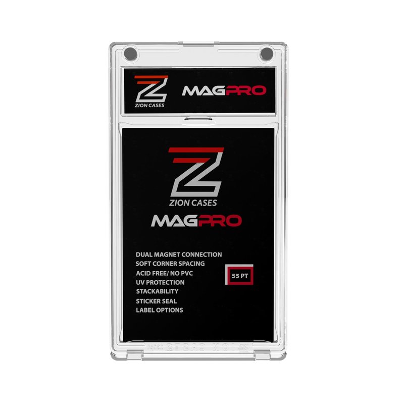 We have redefined the Magnetic Card Holder! Introducing the Magpro by Zion Cases. This version of the trading card holder has new features and upgraded options that will give the collector more protection and appeal in the trading card hobby or at trade night events. Zion Cades is continuously developing new products that provide each card collector with precisely what they need to protect their trading cards. MagPro has quickly become the go-to choice for collectors looking to protect their valuable cards and have that graded card look simultaneously. Whether someone is a seasoned collector or just starting, MagPro is the perfect solution for anyone looking to protect their collection. Magnetic card holders for trading cards on the market today have a single magnet closure that we felt was not sufficient to prevent unintended or accidental openings. That's why we created MagPro with 2 powerful magnets for optimal security of your valuables and a lot more. The MagPro magnetic card case is compatible with all Zion Slab Cases, and the clear plastic offers secure protection of your valuable trading cards without losing that crisp graded card look. MagPro was designed similar in size to the standard PSA graded card slabs to ensure uniformity across your collection. MagPro features a double-hinged bottom for easy card placement and removal, soft spacing on all four corners, Acid and PVC-free plastic that ensures UV protection, and embossed edges so you can easily stack. We also offer six card holder sizes to choose from and the ability to customize your MagPro labels to make your collection unique.