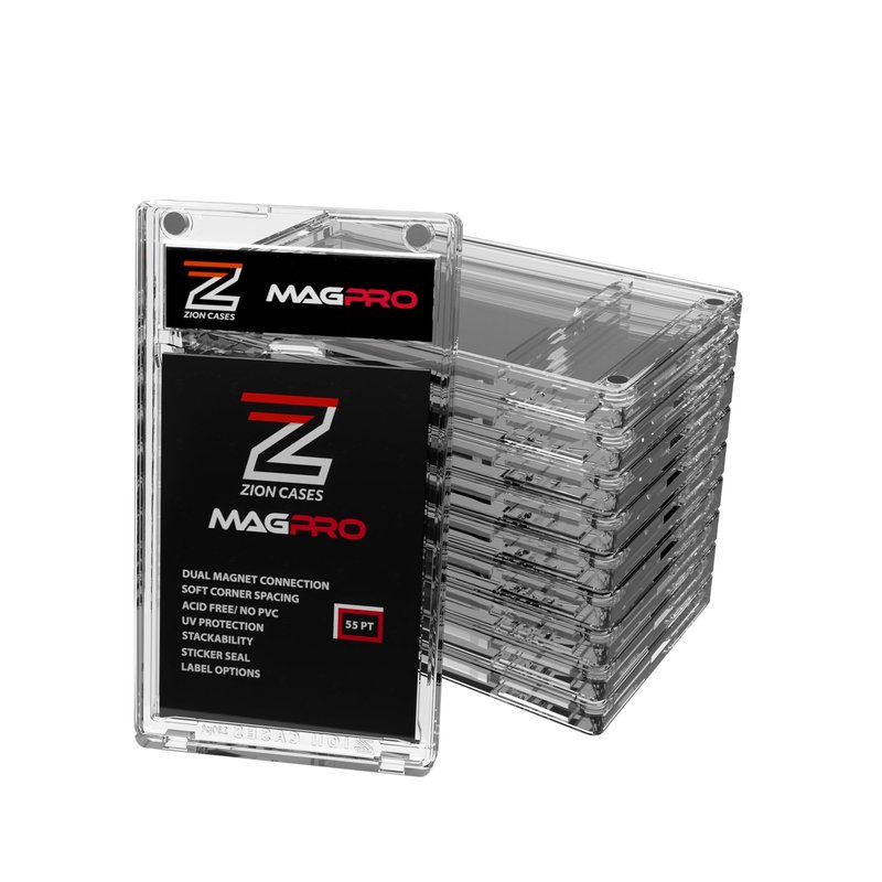 We have redefined the Magnetic Card Holder! Introducing the Magpro by Zion Cases. This version of the trading card holder has new features and upgraded options that will give the collector more protection and appeal in the trading card hobby or at trade night events. Zion Cades is continuously developing new products that provide each card collector with precisely what they need to protect their trading cards. MagPro has quickly become the go-to choice for collectors looking to protect their valuable cards and have that graded card look simultaneously. Whether someone is a seasoned collector or just starting, MagPro is the perfect solution for anyone looking to protect their collection. Magnetic card holders for trading cards on the market today have a single magnet closure that we felt was not sufficient to prevent unintended or accidental openings. That's why we created MagPro with 2 powerful magnets for optimal security of your valuables and a lot more. The MagPro magnetic card case is compatible with all Zion Slab Cases, and the clear plastic offers secure protection of your valuable trading cards without losing that crisp graded card look. MagPro was designed similar in size to the standard PSA graded card slabs to ensure uniformity across your collection. MagPro features a double-hinged bottom for easy card placement and removal, soft spacing on all four corners, Acid and PVC-free plastic that ensures UV protection, and embossed edges so you can easily stack. We also offer six card holder sizes to choose from and the ability to customize your MagPro labels to make your collection unique.